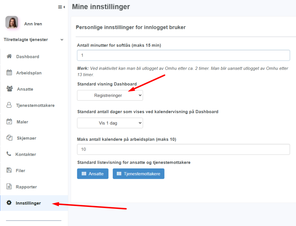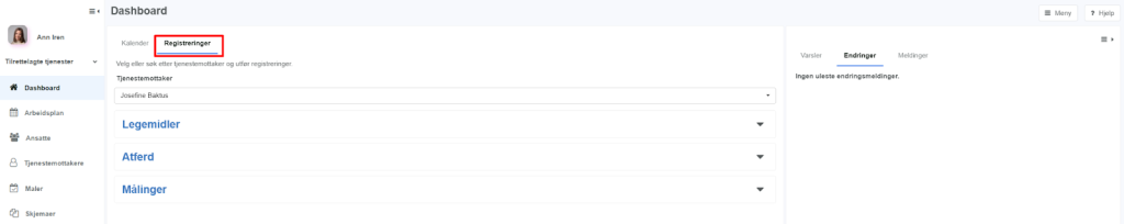 Hent opp tjenestemottakeren du skal registrere på,  og du vil se alle aktive atferdsregistreringer, målinger og legemidler.Ønsker du å ha registreringer som standard visning fra ditt dashboard finner du dette inne på innstillinger.