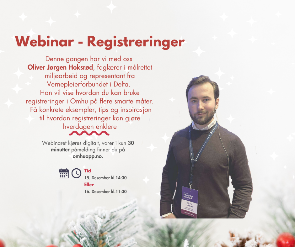 Vi kjører i gang med årets siste webinar, denne gangen er temaet registreringer. Dette vil du ikke gå glipp av, les mer om webinaret og meld deg på her: Webinar: Registreringer i Omhu –  Smart datafangst