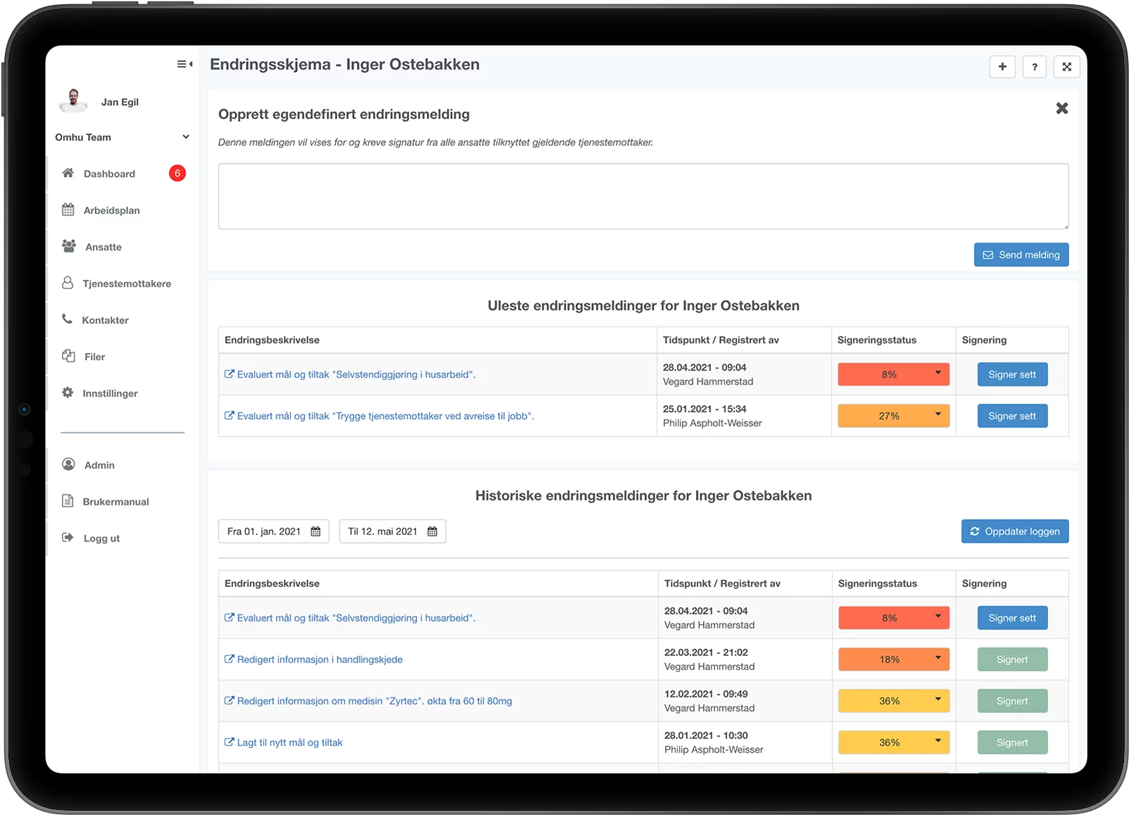 Ved endringer i ulike tiltak eller behandlingsopplegg, kan du velge om du ønsker å sende endringsmelding til personer tilknyttet en tjenestemottaker. Ved innlogging vises gjeldende endringsmeldinger i Omhus dashboard. De ansatte signerer for at endringen er lest, og det genereres en signeringsstatus over de som har lest og signert.